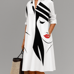 - Kunstnerisk print: Kunstnerisk sort-hvidt print tilføjer karakter uden at forstyrre kjolens elegante balance.