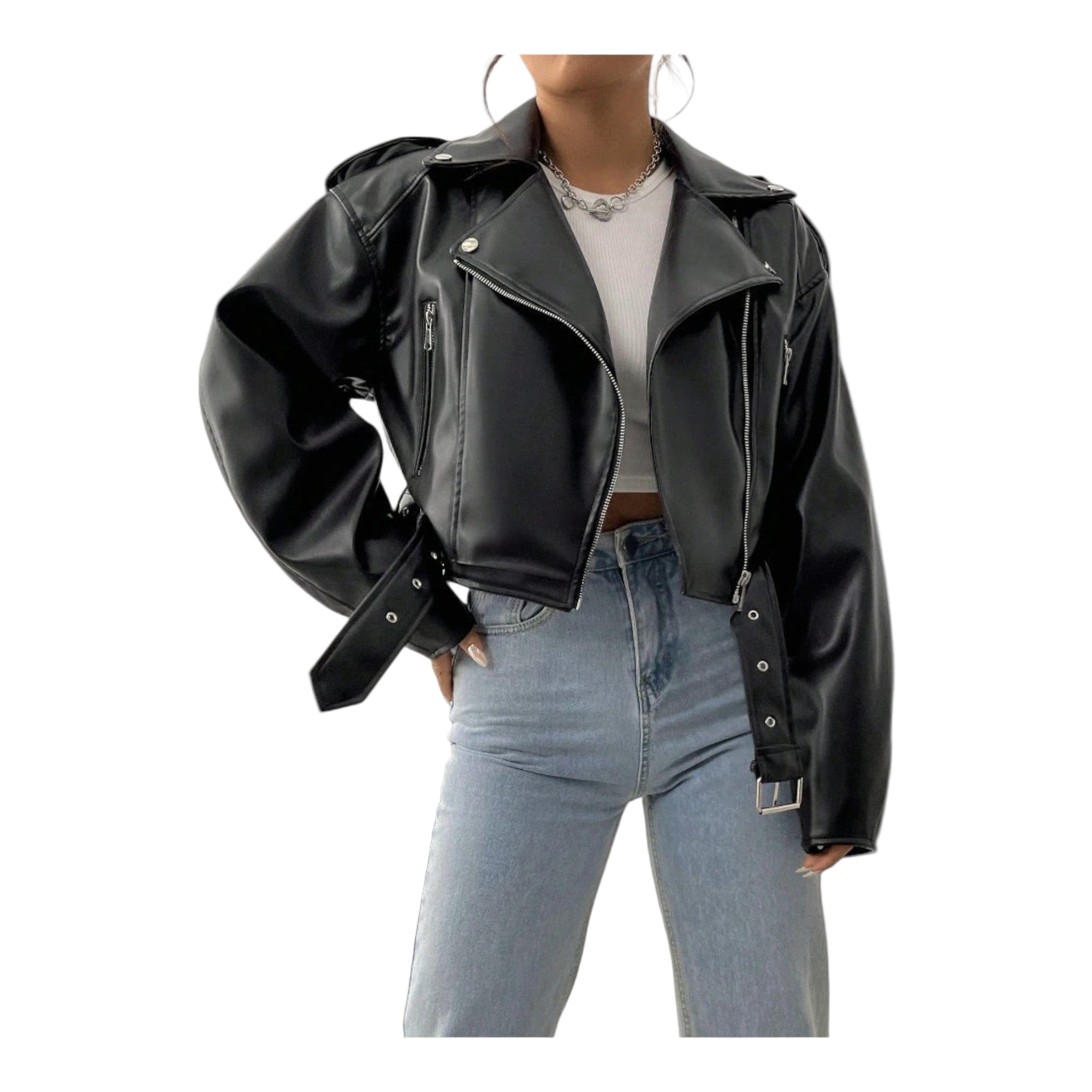En kort jakke i læderlook med bælte, der fremhæver taljen og løfter ethvert outfit med sofistikeret kant. Den formfaste pasform skaber en flatterende silhuet, mens frontlynlås og metaldetaljer giver karakter. Let indvendigt og slidstærk udvendigt — perfekt fra dag til aften.