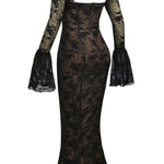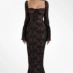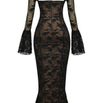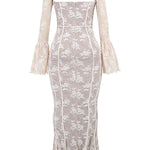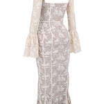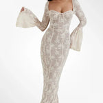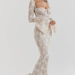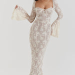 Allegra™ er en lang kjole i delikat blondestof, skabt til kvinder der desejner at udstråle ynde, finesse og romantik. Den transparente struktur og de fine detaljer gør den perfekt til særlige lejligheder, hvor du vil føle dig både sofistikeret og fri.