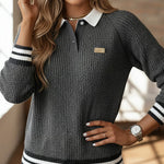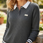 Safira™ giver et grafisk, elegant twist: blød strik med kontrastkrave, behagelig pasform og rene afslutninger. Perfekt alene eller som lag under blazere og frakker — fra casual til chic på et øjeblik.