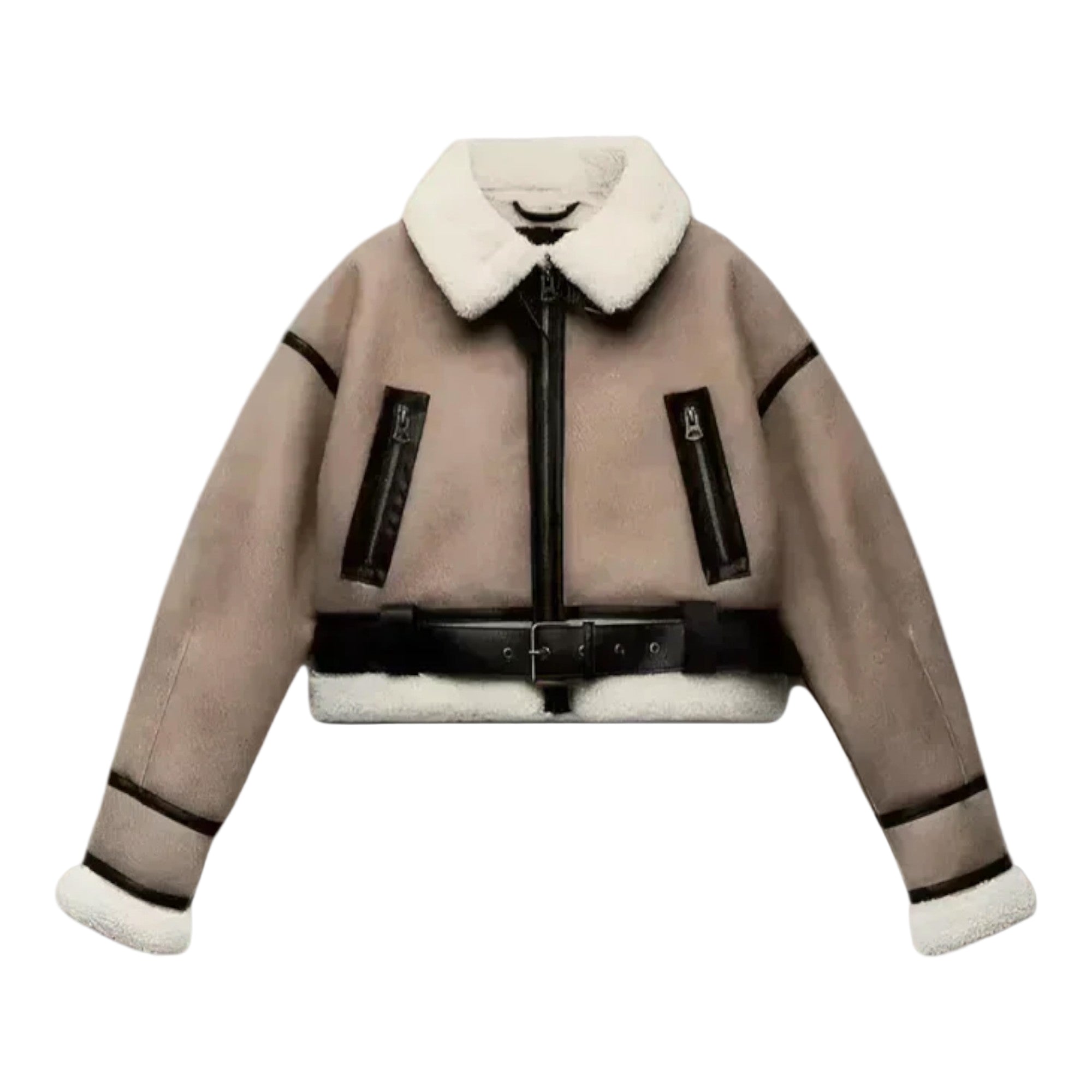 En jakke i læderlook med blødt for og justerbart bælte, der fremhæver taljen. Den formfaste silhuet og metal­detaljer giver et moderne, sofistikeret udtryk, mens frontlynlås og praktiske lommer gør den funktionel i hverdagen — fra casual til chic.
