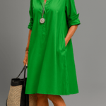 Astrid | Smaragd midi-kjole udstråler klassisk elegance og diskret selvtillid. Kjolen præsenterer en tidløs silhuet i en dyb smaragdgrøn nuance og et udsøgt snit, der giver et look, der aldrig går af mode. Den strukturerede skjortekrave, frontknapperne og det let A-formede skørt fremhæver taljen og flatterer kroppen uden unødvendig pynt. Enkel, raffineret og uforglemmelig – Astrid er resultatet af omhyggeligt håndværk og varigt design, som tilfører garderoben en lang levetid og en følelse af eksklusivitet, der står tidens prøve.