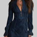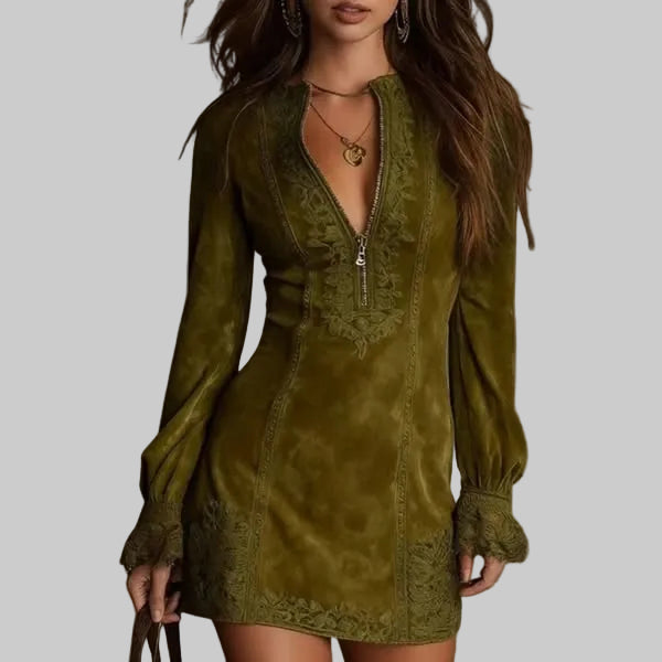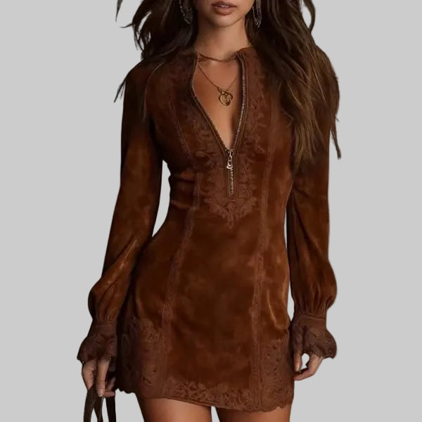 Denne blå minikjole i ruskindslook tilbyder en smuk, selvsikker silhuet, der er designet til at smyge sig flatterende med lethed. Den let tilpassede form følger kroppens blidt, mens den elegante lynlåsudskæring tilføjer et moderne, iøjnefaldende touch. Delikate detaljer langs sømmene og udskæringen giver en subtil raffinement og skaber et look, der føles både feminint og moderne. Perfekt til aftener, særlige øjeblikke eller når du ønsker en kjole, der blander charme med underspillet sofistikering.