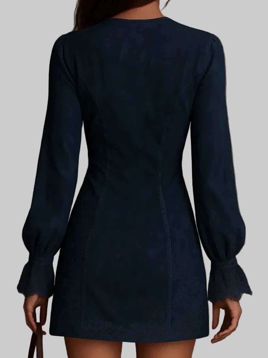 Træd ind i ubesværet elegance med vores blå ruskindsminikjole, en perfekt balance mellem vintage-romantik og moderne touch. Mærk det bløde ruskind omfavne din figur, mens delikat blonde følger hver kurve; selvtilid har aldrig følt sig så luksuriøs.